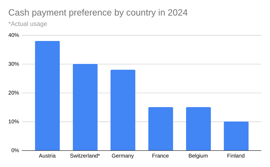 Globally, mobile wallets are used by over 4 billion people (53% of the population). But usage varies a lot within the DACH region. Switzerland leads the group, with an adoption rate of 83% (higher than the 72% EU average). Germany follows at 60%, and just 18% of people in Austria used a mobile wallet in 2024.